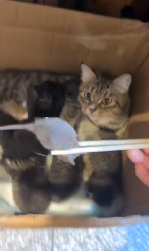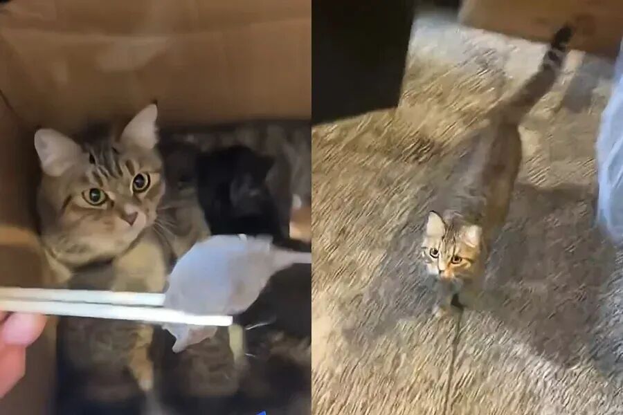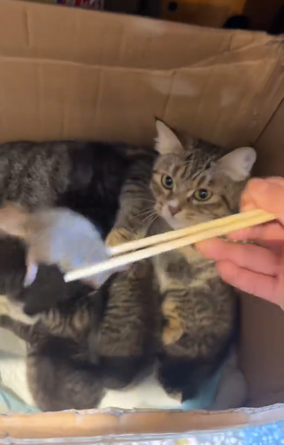 一只狸花猫妈妈日前在喂奶的时候,发现饲主拿着一双筷子缓缓走近,在小猫堆里东翻西找,最后真的找出一只混在里面的小老鼠,让猫妈妈瞬间眼睛瞪得超大,还冲出猫窝想要把自己的孩子抢回来。